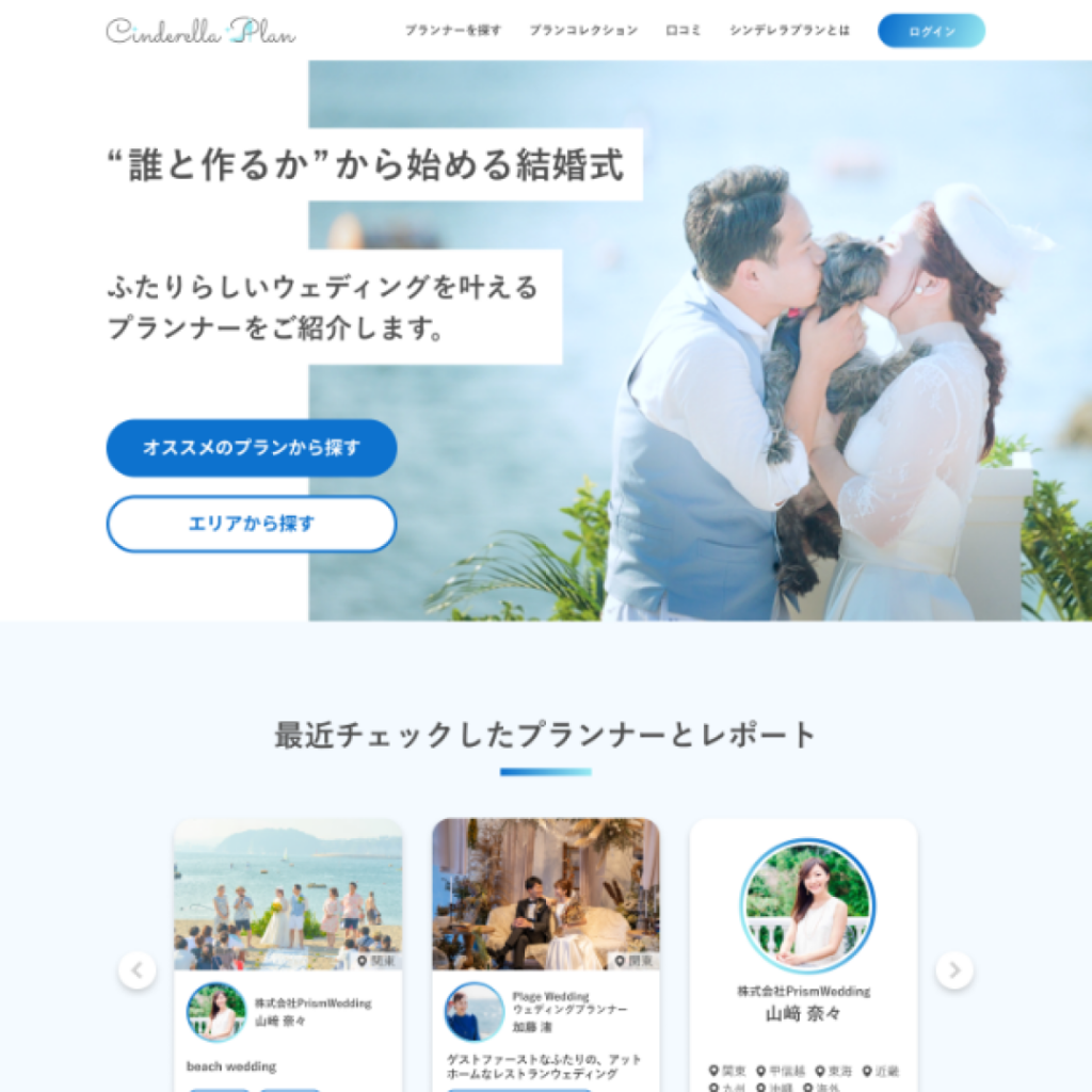 ウェディングプランナーのマッチングサイト。コンペ応募作品です。ロゴの青を基調に青のグラデーションで統一感を出しました。温かみのあるウェディングをイメージさせるような優しい雰囲気にしました。